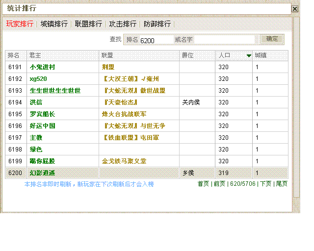 在游戏中,城市人口指的是城镇内的居民数,不包括兵力,玩家排行就是根据居民数判定的。 在游戏中可以通过玩家排行来查询到