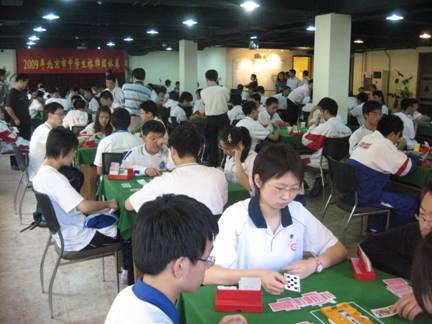 近一两年来,随着全国中学生桥牌赛的举行,桥牌项目已经进入智运会和大运会,也开始进入大学课堂,北京中学生桥牌活动逐渐升温。北京十二中近年在校内四个年级开设桥牌选修课,最多时每学期有170余人选修桥牌课程,同时十二中积极组织学生参加丰台区中学生赛和全国通讯赛等比赛并取得好成绩。2008年底,十二中成立桥牌协会,表明学校在有了广泛的群众基础后对桥牌活动重视并开始进行有组织的领导和管理。北京四中是北京市的桥牌传统学校,曾经的辉煌在尘封多年后也走出沉寂,今年年初通过校内桥牌联赛的方式使桥牌运动得以复苏,迅速普及。一批新手通过边赛边学的形式逐渐了解桥牌,提高了牌技,本次比赛他们派出队伍最多,达到十一支队伍。清华附中、北大附中近年在校内均开有桥牌选修课,并受到学生的喜爱。丰台实验小学也开展了桥牌活动。本次参赛队伍还有北京十八中、丰台二中,由于丰台区中小学桥牌协会的努力推广,丰台区已连续两年成功举办了区级中小学生桥牌比赛。除此之外,海淀区北航附中、上地实验中学也都在校内开展了桥牌培训活动。异军突起的人大附中开办桥牌课是在2007年,并于2007和2008年连续两年组队参加了全国中学生桥牌赛,在比赛的过程中通过和上海市及全国其它省市领队老师的交流,对在中学开展桥牌活动有了更全面的认识,人大附中主动与北京桥协和其它中学联系,倡议进行校际邀请赛。与此同时,北京市桥牌协会也积极创造条件恢复北京市的中学生桥牌比赛。