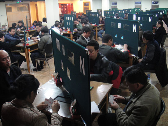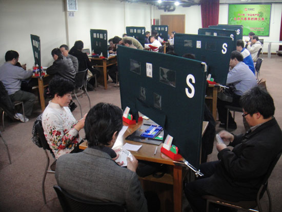 2010年“华远地产杯”北京市春季桥牌大赛混合双人赛刚刚结束,公开双人赛于4月6日在北京市桥牌活动中心拉开战幕。本次公开双人赛报名十分踊跃,共有七十二对牌手报名参赛,今天进行的是第一场预赛。比赛分A、B、C、D四个组,每组九桌,使用拉幕,全场同牌,统一算分。经过24副牌的激烈争夺,全部名次排定(详细成绩见本站成绩公布)。目前,唐涤飞/田忠、聂宝平/臧培杰/和李学士/刘建平暂列预赛前三名。明天将进行第二场预赛。